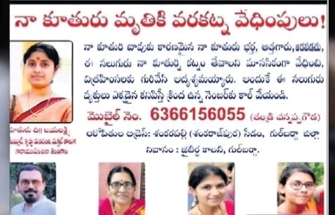 నారాయణ్ పేట కు చెందిన చానప్ప కూతురు జయ లక్ష్మి కొద్ది నెలల క్రితం ఆత్మ హత్య చేసుకుంది, పోలస్ లకి పిర్యాదు చేసినా న్యాయం జరగలేదు అన్న ఆవేదన తో కూతురు మృతి కి కారణం ఐన భర్త, అత్త ఆడపడుచు అదృశ్యం ఐయ్యారు, కనిపిస్తే నాకు సమాచారం ఇవ్వండి అంటూ జాతీయ రహదారి పై ఫ్లెక్సీ ఏర్పాటు చేసాడు