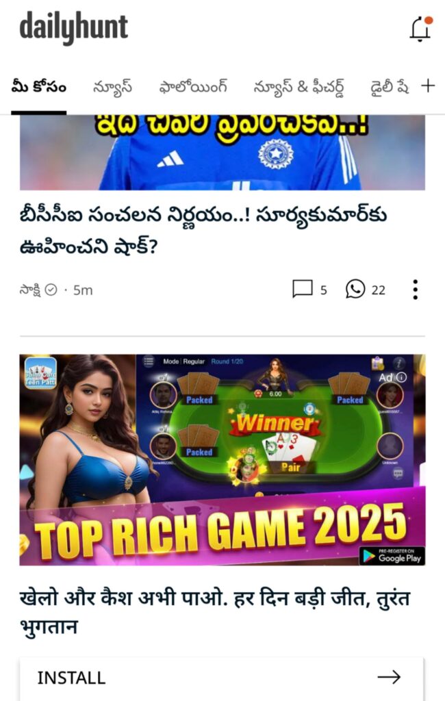 దేశంలో కోట్లాది మంది రోజూ వార్తల కోసం వినియోగించే ప్రముఖ న్యూస్ అగ్రిగేటర్ యాప్ Dailyhunt ఇప్పుడు తీవ్ర విమర్శలకు గురవుతోంది. కారణం – ఆన్లైన్ గేమింగ్ / క్యాష్ గేమ్స్ / బెట్టింగ్ తరహా యాప్లకు భారీగా ప్రమోషన్ ఇవ్వడం.